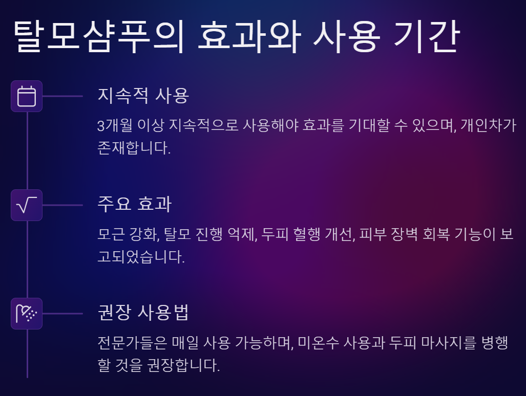 👉 개인차가 있지만 보통 3개월 이상 탈모샴푸 사용 시 눈에 띄는 효과를 볼 수 있습니다.